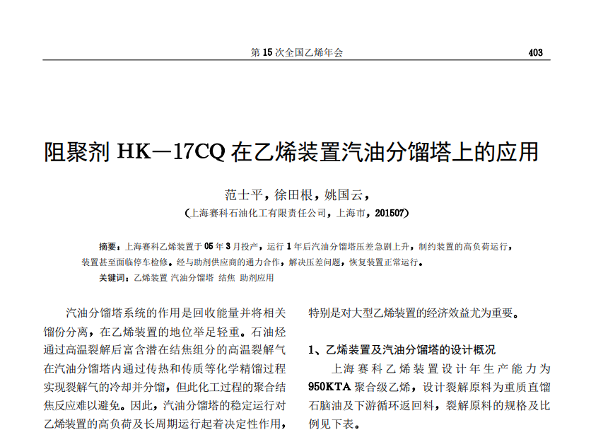 用于乙烯厂急冷油塔系统、压缩系统、脱戊烷塔系统,具有抗氧、阻聚、清净、分散等作用,有效防止聚合污垢的产生。